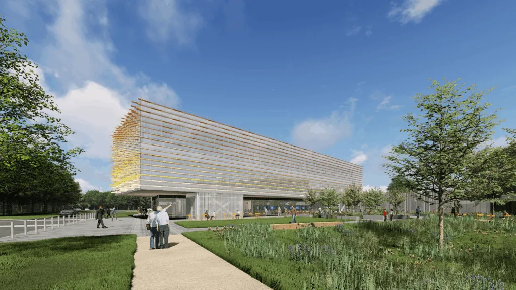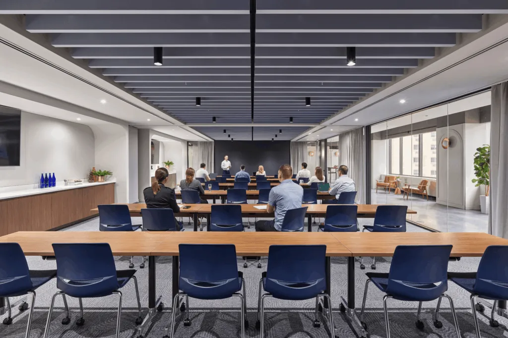 The majority of the ceilings were exposed decks, and care was taken to address acoustics. The conference center used K13 cellulose spray insulation to help absorb sound, and the remaining areas were adorned with felt baffle ceilings and pendant lighting to help achieve a functional and polished appearance. Custom lacquer paneling with decorative casing accents the space, and fabric and metal mesh draperies provide privacy and additional sound absorption. The fitness center incorporates a custom wood slat wall, graphic wall coverings, and light shelves, and looks out over the new pickleball court. Tiled locker rooms provide an added amenity for building occupants.