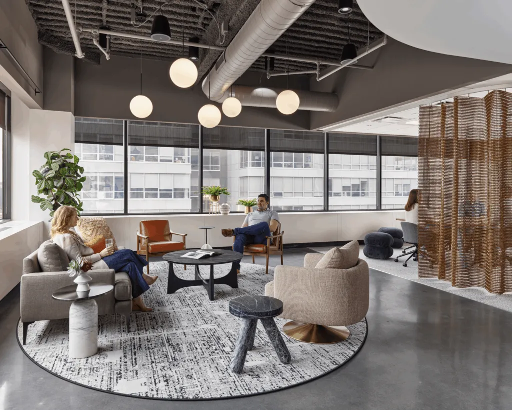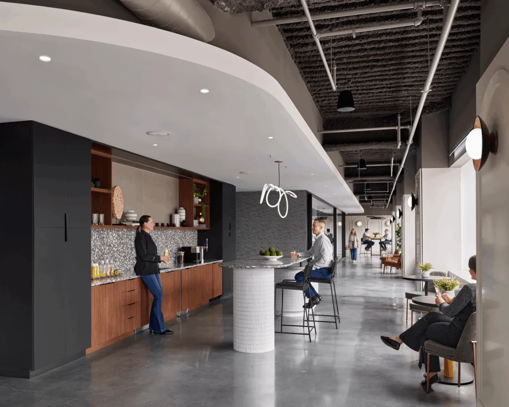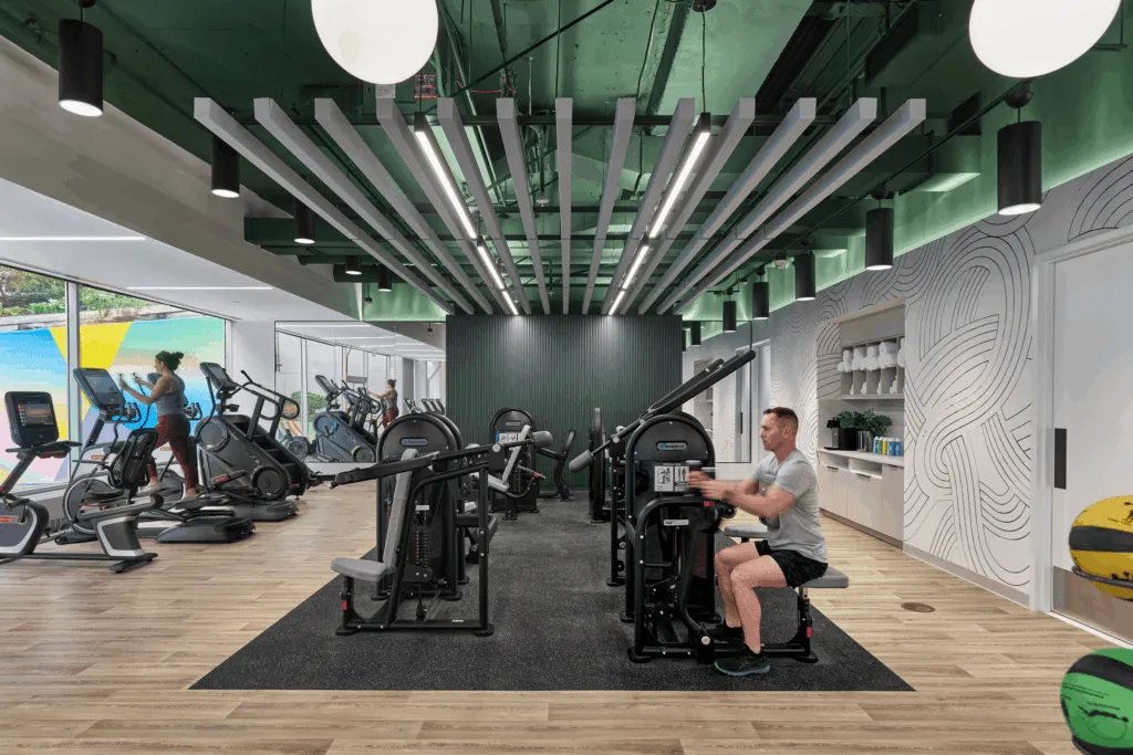 Working in an occupied office building, the amenity conference area required a complete gut of the existing sixth-floor space. Finishes were stripped and upgraded in the common corridors and elevator lobby. Complete demolition of an existing space in the basement made way for a new fitness center with locker rooms and access to a fresh-air pickleball court, a previously underutilized below-grade outdoor seating area for the building. Slate pavers were removed to facilitate a new level playing surface, and the exterior building walls were refreshed with a new custom mural.