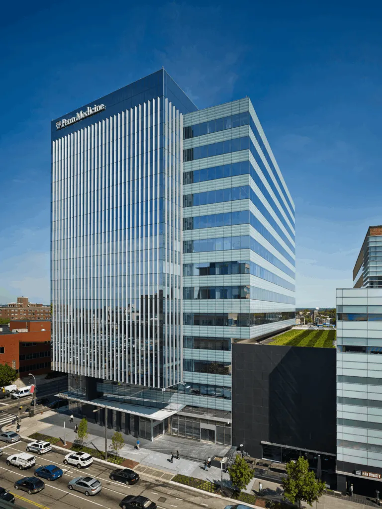 The building has a steel frame and composite metal deck structural system. The exterior wall is a combination of insulated glass panels with crystal grey tinting in an aluminum-framed curtain wall with spandrel panels. The ground floor has granite stone veneer in keeping with surrounding buildings. In addition to the base building, INTECH worked with Penn Medicine University City to fit out approximately 200,000 square feet of space, accommodating a community health facility, an outpatient physical therapy practice, exam rooms, and offices. We also completed a 20,400-square-foot space for the Biedermann Biomechanical Research Laboratory. The building was the first approved clinical facility in the Commonwealth of Pennsylvania to utilize active chilled beam technology with enthalpy heat wheel recovery. The application of this system has significantly enhanced flexibility and reduced energy demand by as much as 30 percent. The technology has also increased patient comfort and provided a quieter environment.