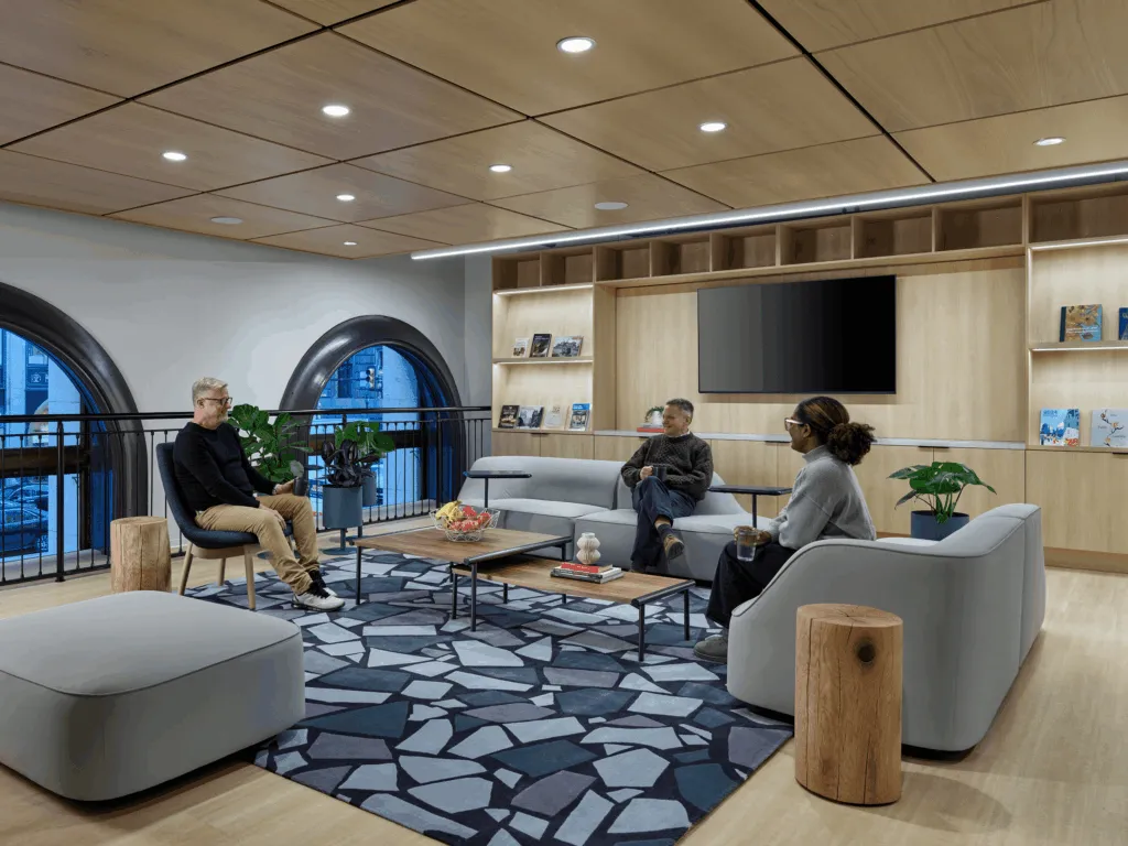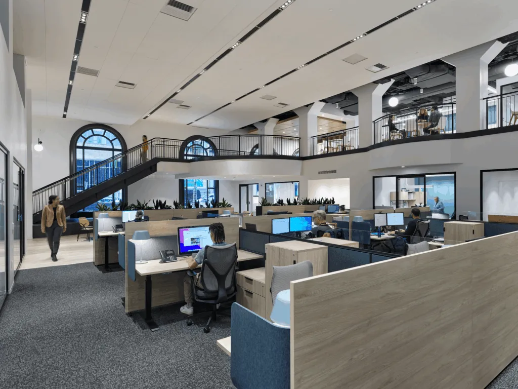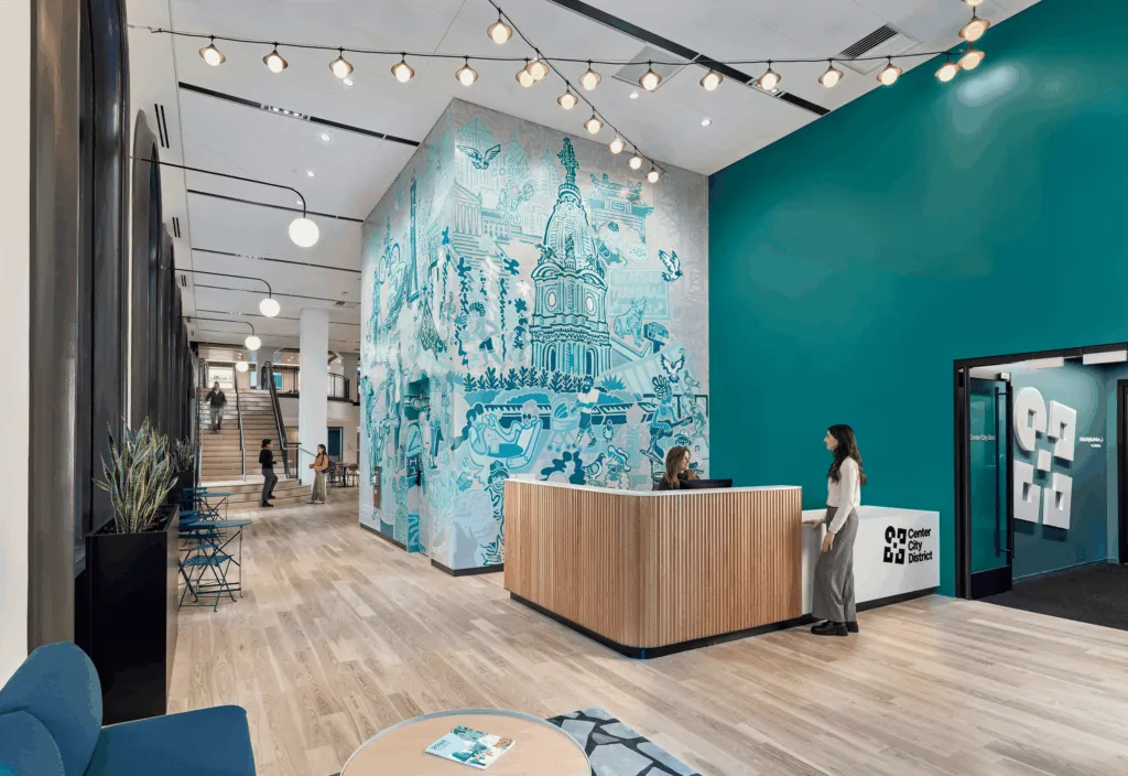 The prominently located fit-out occupies the ground floor and mezzanine level of the central Land Title Building, one of the first high-rise office towers in Philadelphia, a stone’s throw from City Hall. The new administrative offices accommodate various Center City District entities, including a City of Philadelphia Police Department substation.
