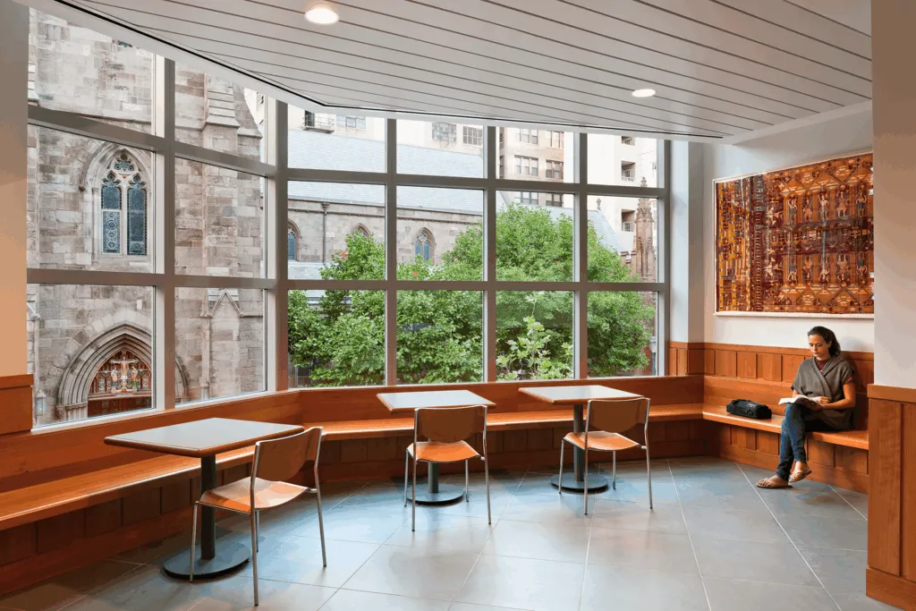 The new building houses student and guest dining rooms as well as a student lounge on the ground level. Teaching studios and rehearsal spaces occupy the second level. The third and fourth floors contain additional teaching space, and the fifth through ninth floors are exclusively residential in a tower configuration. The project capitalized on the urban site’s prime location near mass transit, as well as recycling demolition and construction debris.