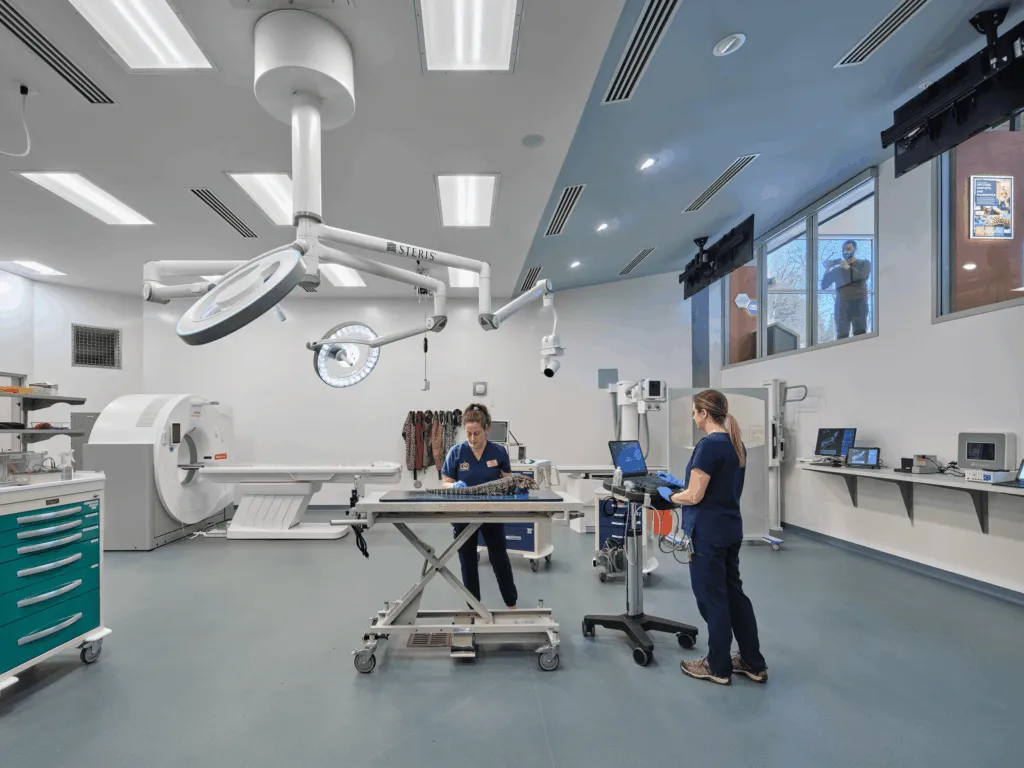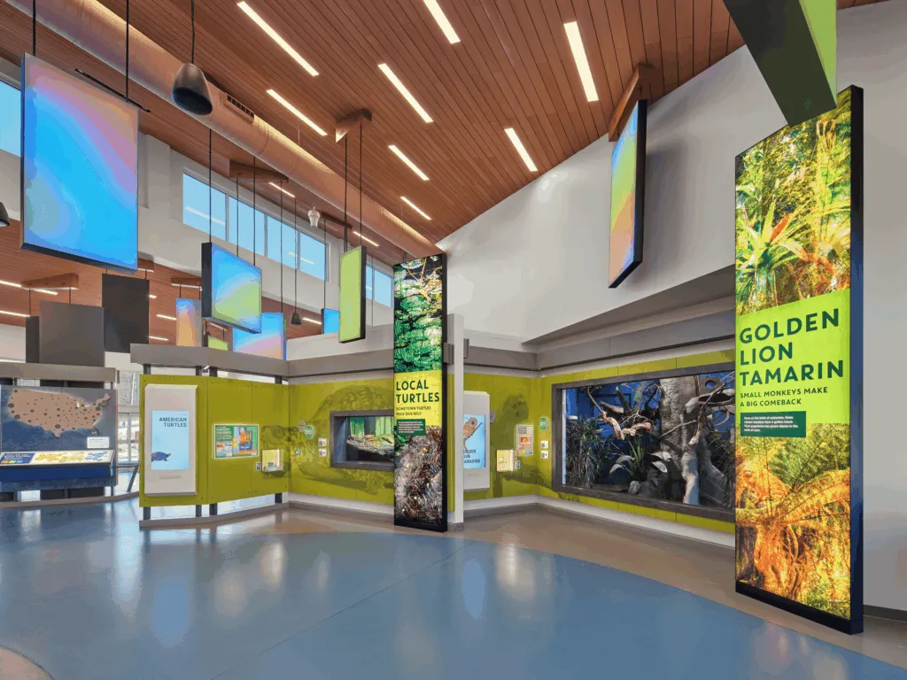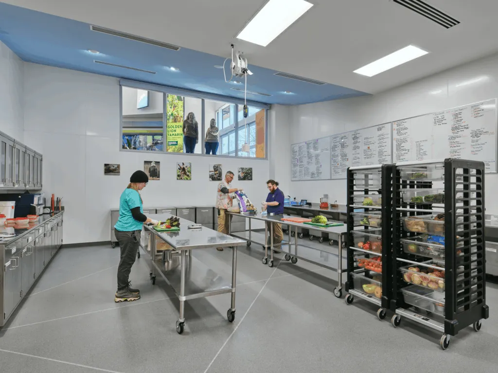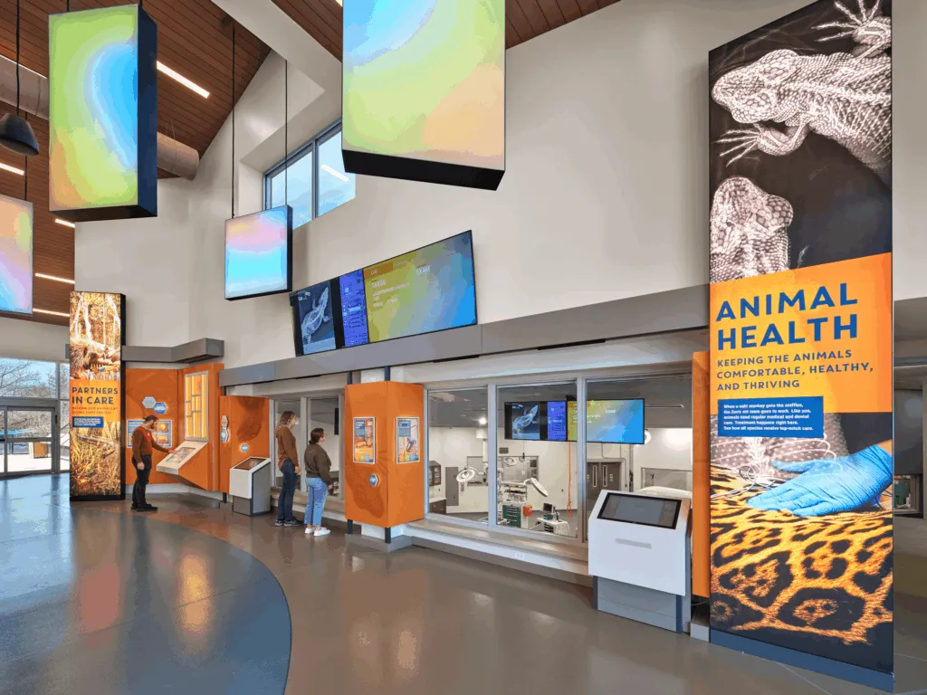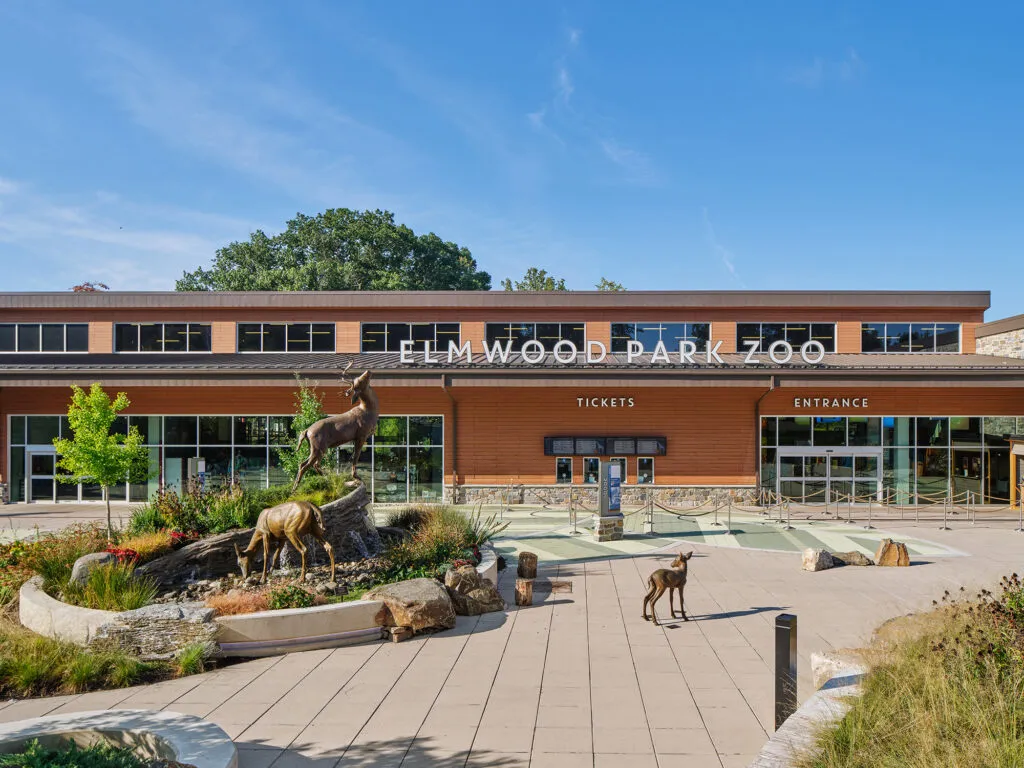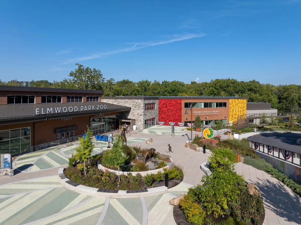 The new Elmwood Park Zoo animal hospital and welcome center are part of a multi-phase renovation and expansion of the zoo’s 73-acre master campus. The project includes extensive site work and the construction of a new animal hospital, a welcome center with exhibit space, a gift shop, and administrative offices. The animal hospital allows veterinarians and technicians to perform surgeries, administer treatments, X-rays, CT scans, and house animals for mating or quarantine scenarios. The full-scale hospital allows the zoo to care for its animals as well as partner with local zoos and animal habitats, and is one of 13 in the United States and the only current zoo where patrons can view treatments in progress from the second-level welcome center. The welcome center includes a coffee shop, interactive exhibits, and a large gift shop. The third level incorporates executive and staff offices with multiple board rooms and an outdoor terrace to accommodate zoo events. Site improvements include a lookout with a pedestrian bridge that overlooks the entry plaza, a 26-foot-diameter fountain with multiple sculptures, an exterior animal exhibit, extensive stormwater management initiatives, eight retaining walls, and a comprehensive paving and landscaping scope.