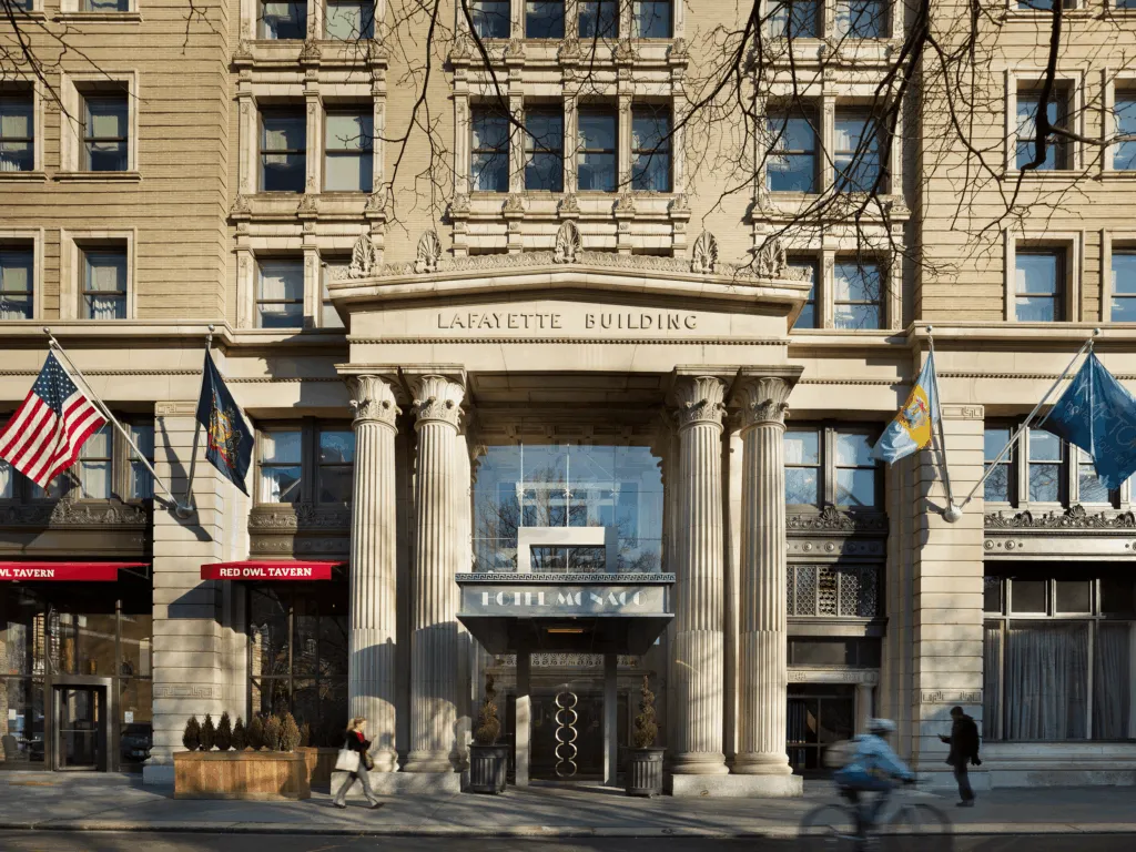 The historic Lafayette Building in the Old City neighborhood of Philadelphia was converted into Hotel Monaco, a luxury boutique hotel brand for Kimpton Hotels and Restaurants. Overlooking Independence Mall, the 270-room hotel features an upscale restaurant, a ballroom, and over 12,000 square feet of meeting space. It was the first hotel to be located directly on the Mall. The signature Hotel Monaco theme is a brightly colored, whimsical space celebrating the world traveler. The client’s eco-friendly focus influenced the Hotel Monaco’s development and incorporated environmentally-conscious practices into its design and operations. The hotel achieved LEED Gold for Commercial Interiors.
