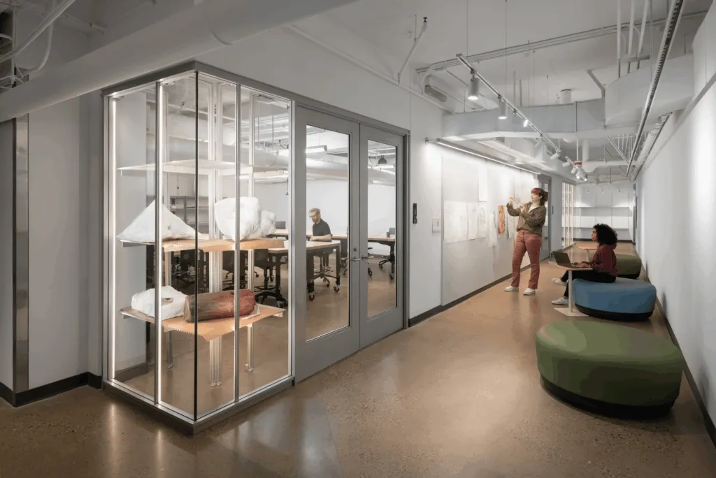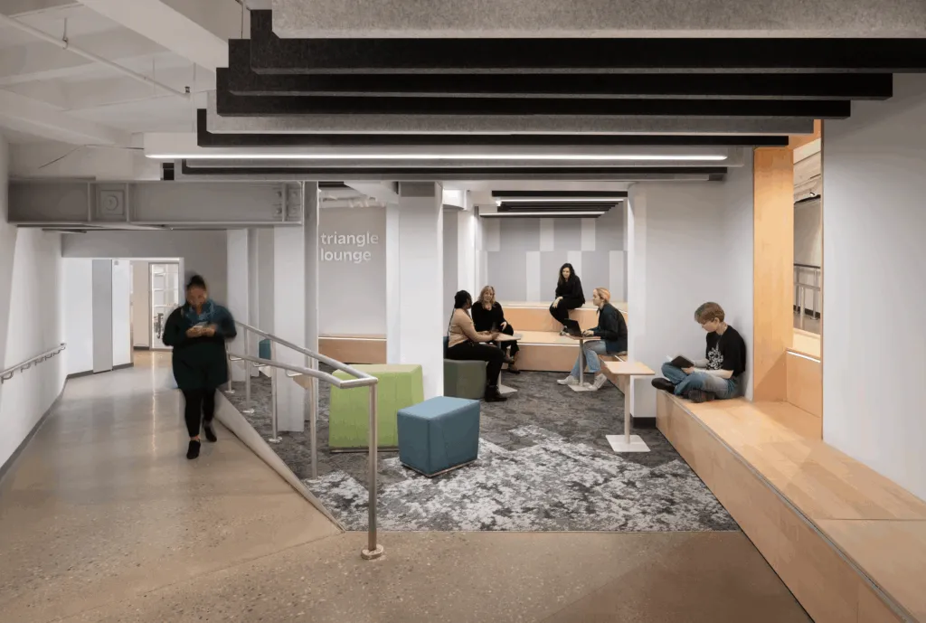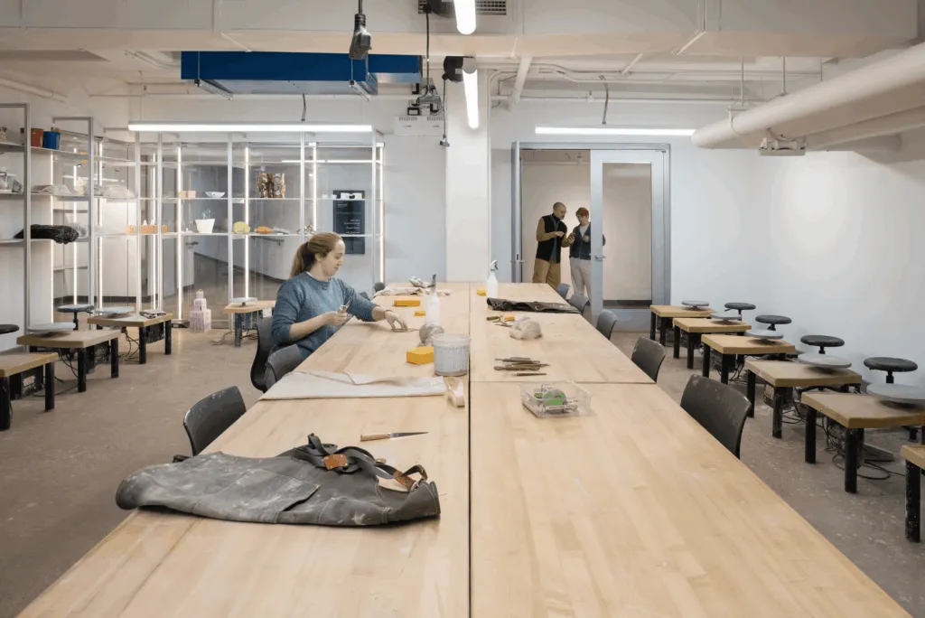 The Moore College of Art & Design renovation enhances learning spaces and encourages moments of collaboration and gathering. A new student walkway at the lower level joins Sarah Peter Hall and Wilson Hall — a connection previously accessed by a series of elevator changes and a brief walk outside. A new student lounge is effortlessly tucked in the found space between buildings. The concourse level of Wilson Hall underwent full architectural and mechanical demolition to make way for new classrooms — a sculpture studio, ceramics studio, kiln room, glaze room, and plaster studio. Sarah Peter Hall incorporates an Animation and Game Arts studio, editing bays, computer labs, and a stop-motion studio. A new gaming lounge offers reprieve from everyday classes. Pin-up walls and art displays are incorporated throughout the renovated level, making use of every surface and ensuring a lively and creative environment.