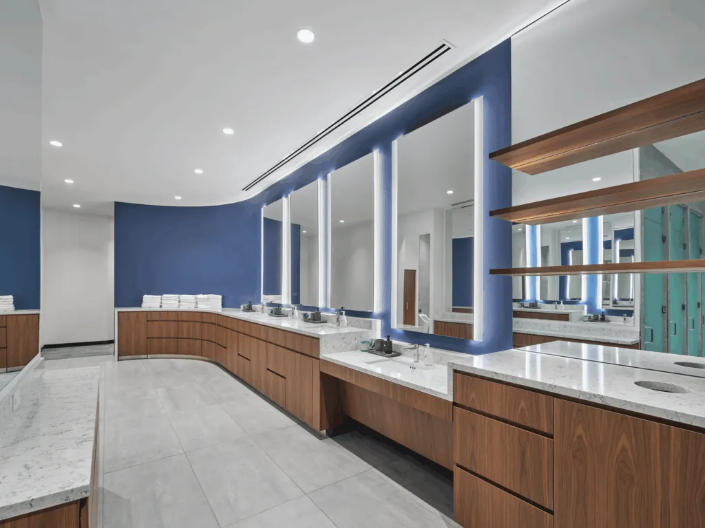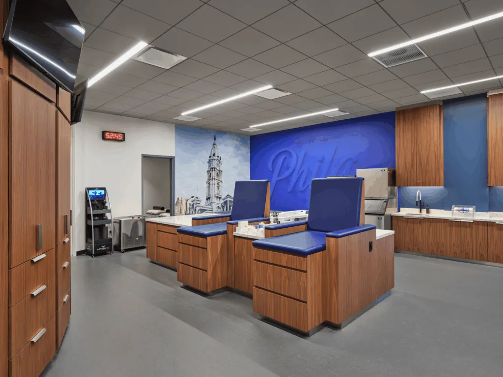 This locker room renovation and expansion at the Wells Fargo Center included a new state-of-the-art locker room, training room, team lounge, video room, coaches’ offices, coaches’ locker room, coaches’ work room, as well as a new owner’s lounge. The project was completed in two phases. Phase 1 included the player areas and was completed for use during the 2022-2023 season. Phase 2 was completed during the off-season for use at the start of the 2023-2024 season.