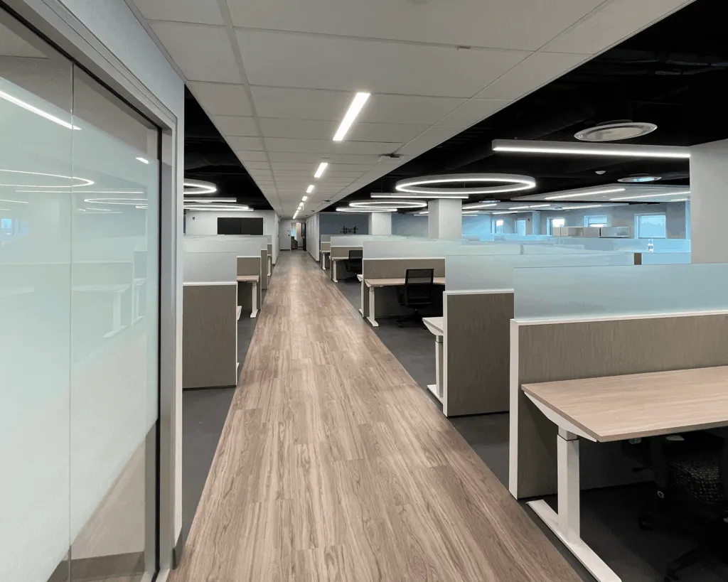 Designed as an open floor plan with few offices and meeting rooms, the second and third floors feature acoustic ceiling clouds that reflect the workstation clusters below. The fourth-floor legal department has a more traditional layout with offices and meeting rooms lining the perimeter of the space and strategic open areas in the middle. The project had undergone many design changes during construction, making effective coordination key to completing the project on time within a tight schedule.
