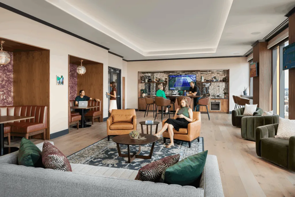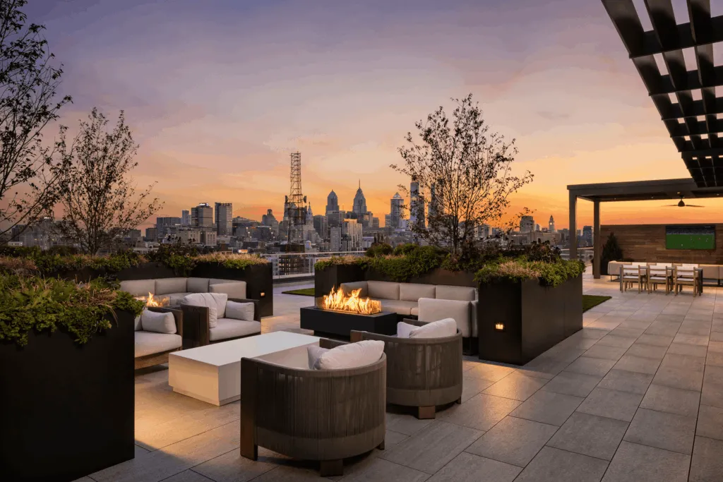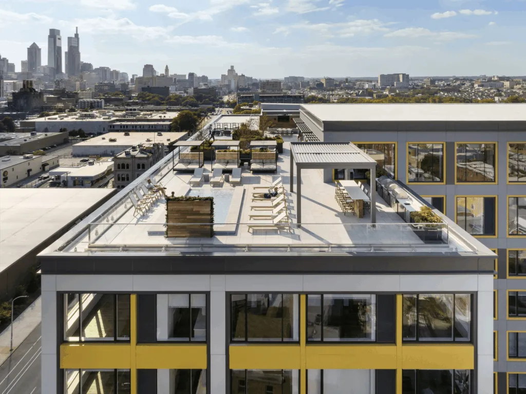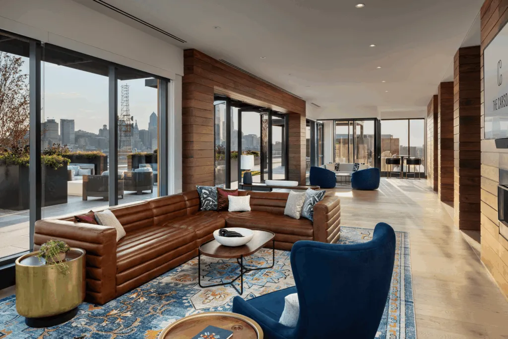 The Carson is a large-scale, mixed-use project occupying an entire block in Northern Liberties with a twelve-story mixed-use residential tower over retail on the eastern portion of the site, and a one-level box grocer space to the west. Generous sidewalks accommodate future outdoor seating for commercial tenants. The building includes a fully accessible parking garage under the entire building and loading areas along a private drive feeding off both 5th and 6th Streets — two elements that facilitate a welcoming, pedestrian-oriented design. Amenities for the residential tenants include a basketball court, gaming lounge, bike storage, and a fitness studio on the first floor. At the roof level, residents can enjoy multiple private and group meeting areas, including a taproom, VR gaming lounge, and a full private gym facility. The interior lounge is flanked by two spacious outdoor roof decks. A more private area on the north side includes seating and a grilling station, as well as a dog-run area. On the south side, the deck has three main seating areas, two grilling spaces, an outdoor TV lounge, and a built-in sunbathing pool and water feature. The shared spaces complement the new 373 residential units — studio, one-, two-, and three-bedroom apartments — and offer expansive views of the Philadelphia skyline and Delaware River.