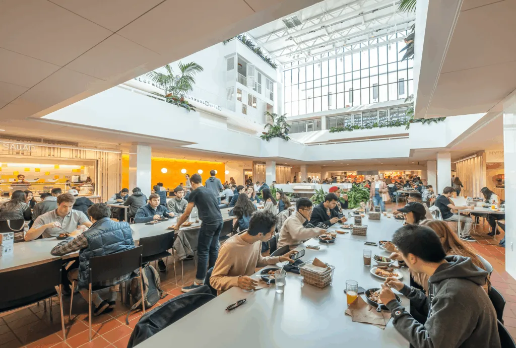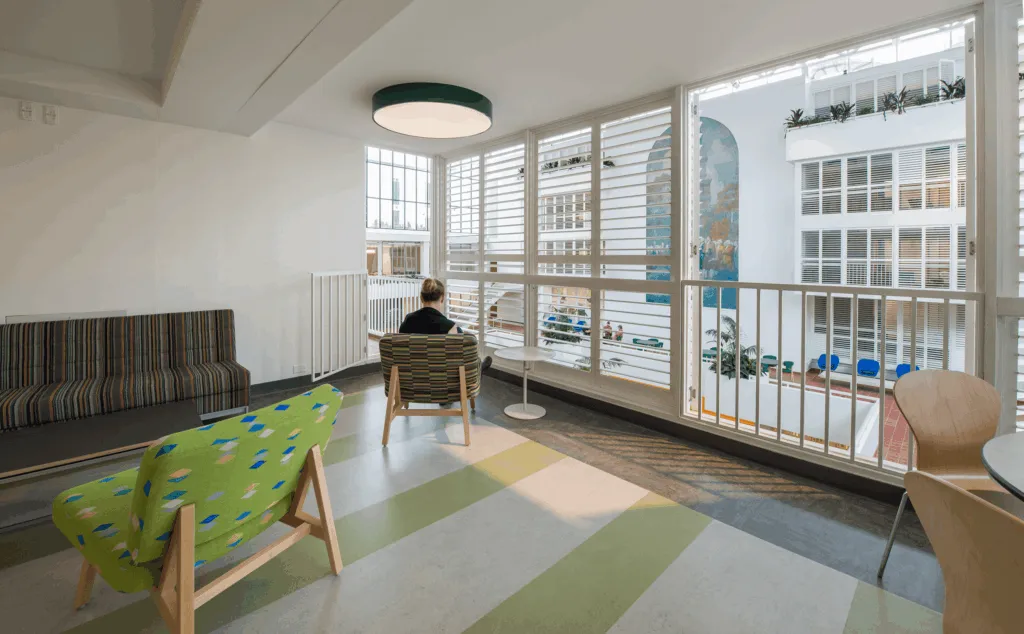 Designed by architect Eero Saarinen in 1958 for the University of Pennsylvania, Hill College House is an internationally recognized architectural landmark. Originally a women’s dormitory, the building’s entry is a bridge, and the surrounding spiked metal fence encloses a grassy moat around the building. The living spaces, including five floors of dorm rooms for 500 (now co-ed) students, lounges, and seminar rooms, are built around a central atrium that overlooks a dining area on the lower level.