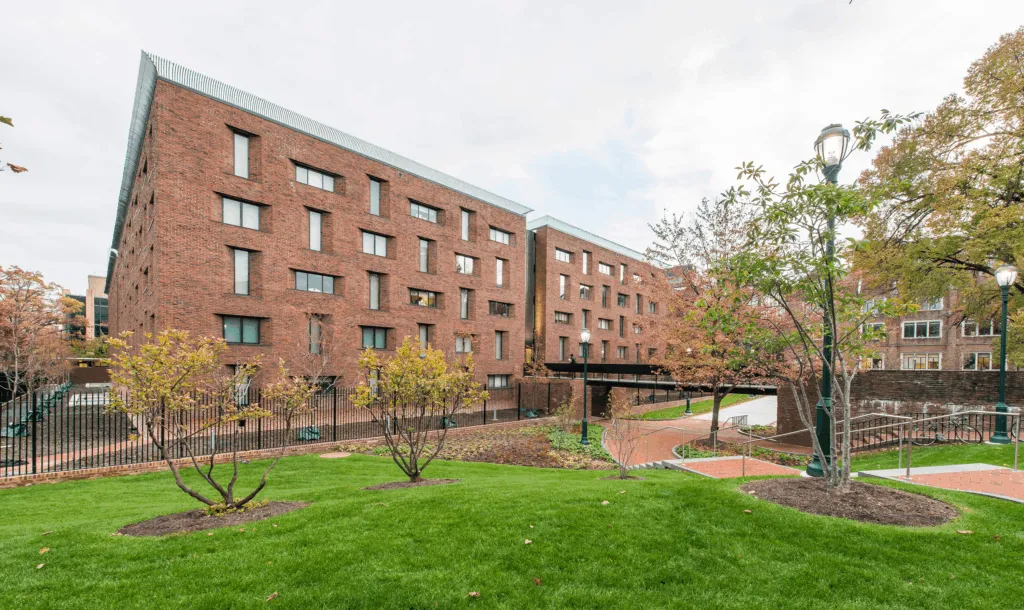 A major renovation of the building addressed its maintenance and upgrade needs. Work included the conversion of all bathrooms to individual restrooms and shower rooms, renovations to all dorm rooms and common spaces, significant upgrades to MEP systems, and a major upgrade to the kitchen and dining areas. The building envelope was improved with a new roof and curtainwall, existing masonry was repaired, and two roof terraces were upgraded. Existing windows were removed, refurbished, and reinstalled as part of the project, and a new bridge was constructed at the building’s entry.
