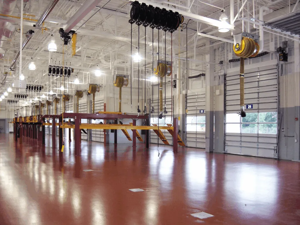 The USPS maintenance facility services the area’s entire fleet with 16 service bays, a wash bay, and a service parts counter. A 30,000-square-foot metal panel building for equipment and tool storage augments the facility. Due to site instability, the foundations were on piles with pile caps and spread footings on top. The structure was a one-story, lightweight steel frame with a composite metal panel enclosure and an EPDM rubber roof. The floor of the service bays was a high-quality, no-mar epoxy finish. With an exposed ceiling in the bay areas, surfaces and pipes were color-coded with a high-gloss finish.