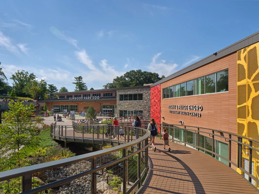 The new Elmwood Park Zoo animal hospital and welcome center are part of a multi-phase renovation and expansion of the zoo’s 73-acre master campus. The project includes extensive site work and the construction of a new animal hospital, a welcome center with exhibit space, a gift shop, and administrative offices. The animal hospital allows veterinarians and technicians to perform surgeries, administer treatments, X-rays, CT scans, and house animals for mating or quarantine scenarios. The full-scale hospital allows the zoo to care for its animals as well as partner with local zoos and animal habitats, and is one of 13 in the United States and the only current zoo where patrons can view treatments in progress from the second-level welcome center. The welcome center includes a coffee shop, interactive exhibits, and a large gift shop. The third level incorporates executive and staff offices with multiple board rooms and an outdoor terrace to accommodate zoo events. Site improvements include a lookout with a pedestrian bridge that overlooks the entry plaza, a 26-foot-diameter fountain with multiple sculptures, an exterior animal exhibit, extensive stormwater management initiatives, eight retaining walls, and a comprehensive paving and landscaping scope.