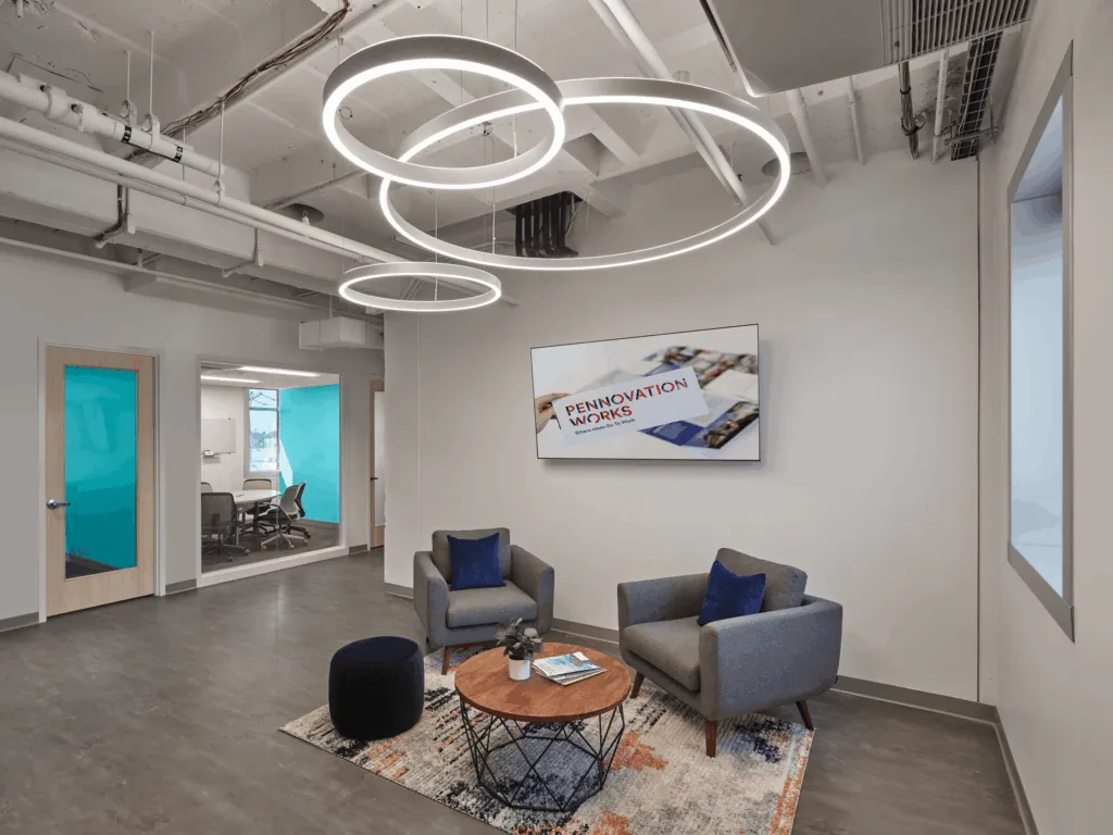 Interius BioTherapeutics is a laboratory fit-out located within Pennovation Lab, a multi-tenant lab and office building nestled in the Pennovation Works complex adjacent to the University of Pennsylvania campus. The project was a three-phase renovation across two floors and included labs, supporting rooms, new offices and conference rooms, and a new lounge area. Troweled epoxy flooring, LVT, and fabric panels personalized the space for Interius’ brand, and open ceiling areas brought out the original character of the building. The spaces incorporated new plumbing for water and acid waste, laboratory gas piping, upgraded HVAC systems, and new electrical panels. The renovation supports Interius BioTherapeutics in expanding the potential of cell and gene therapy by developing next-generation delivery technology.