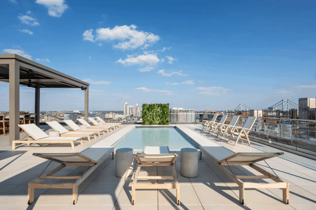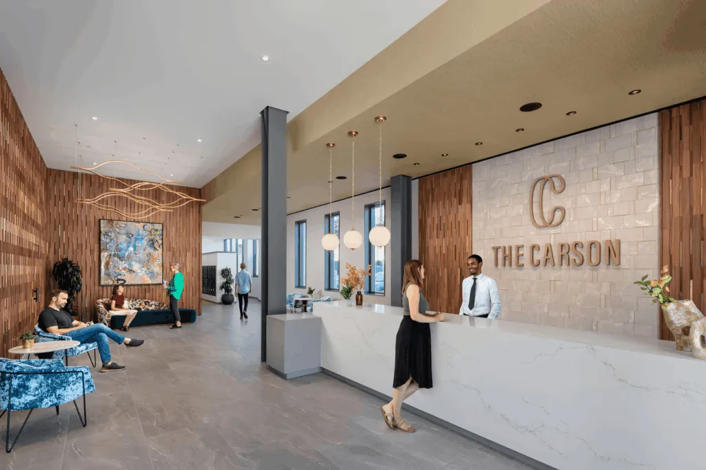 The Carson is a large-scale, mixed-use project occupying an entire block in Northern Liberties with a twelve-story mixed-use residential tower over retail on the eastern portion of the site, and a one-level box grocer space to the west. Generous sidewalks accommodate future outdoor seating for commercial tenants. The building includes a fully accessible parking garage under the entire building and loading areas along a private drive feeding off both 5th and 6th Streets — two elements that facilitate a welcoming, pedestrian-oriented design. Amenities for the residential tenants include a basketball court, gaming lounge, bike storage, and a fitness studio on the first floor. At the roof level, residents can enjoy multiple private and group meeting areas, including a taproom, VR gaming lounge, and a full private gym facility. The interior lounge is flanked by two spacious outdoor roof decks. A more private area on the north side includes seating and a grilling station, as well as a dog-run area. On the south side, the deck has three main seating areas, two grilling spaces, an outdoor TV lounge, and a built-in sunbathing pool and water feature. The shared spaces complement the new 373 residential units — studio, one-, two-, and three-bedroom apartments — and offer expansive views of the Philadelphia skyline and Delaware River.
