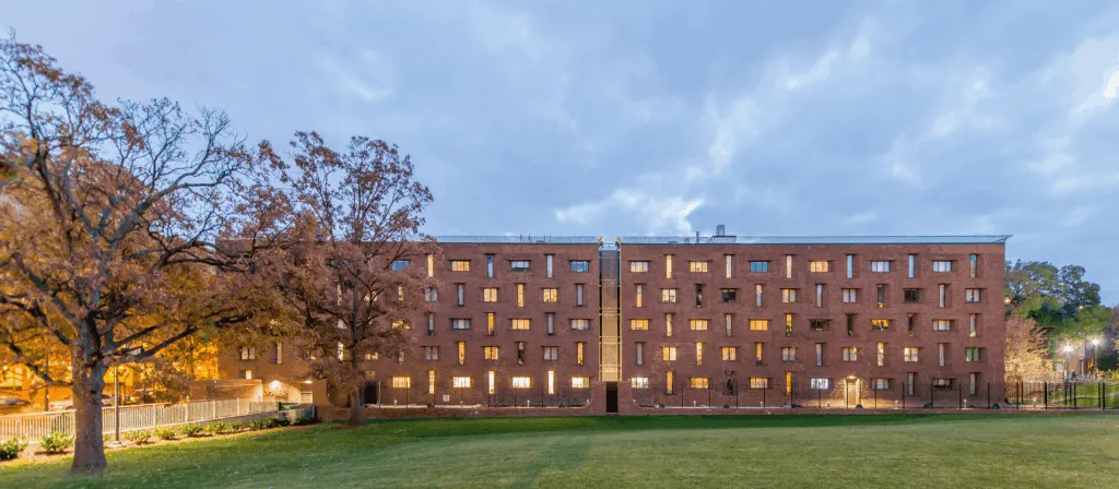 A major renovation of the building addressed its maintenance and upgrade needs. Work included the conversion of all bathrooms to individual restrooms and shower rooms, renovations to all dorm rooms and common spaces, significant upgrades to MEP systems, and a major upgrade to the kitchen and dining areas. The building envelope was improved with a new roof and curtainwall, existing masonry was repaired, and two roof terraces were upgraded. Existing windows were removed, refurbished, and reinstalled as part of the project, and a new bridge was constructed at the building’s entry.